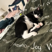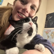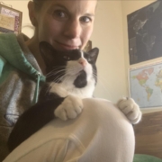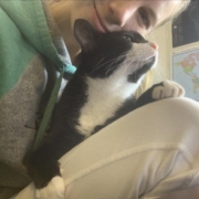 My tuxedo kitty Annie Oakley, featured here, teaches me to play, rest, and enjoy the moment. She follows me around meowing until I sit down with her and allow her comforting purring self to rest on my chest and fill my heart. She is like my inner child within me who craves the peace that comes from being nurtured with relaxation.